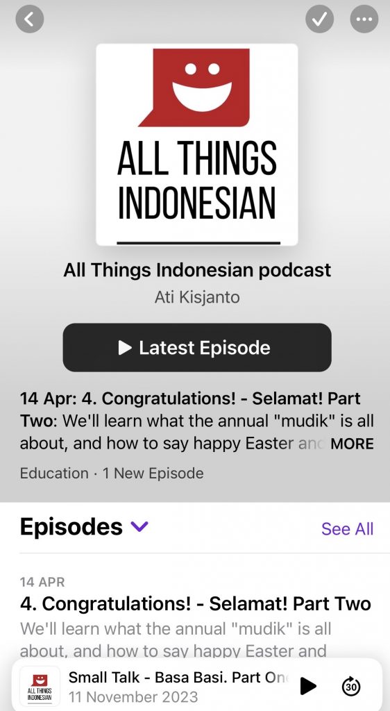 Ati’s podcast All Things Indonesian is available on Apple Podcasts and Spotify. It is for people who would like to learn about Indonesian language and culture.