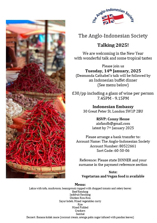 There are still a few places available for the AIS dinner at the Indonesian Embassy on January 14th. We need to confirm numbers with the caterer at 1pm on Friday 10 January. Members who wish to attend must RSVP and pay by the deadline. Details below.