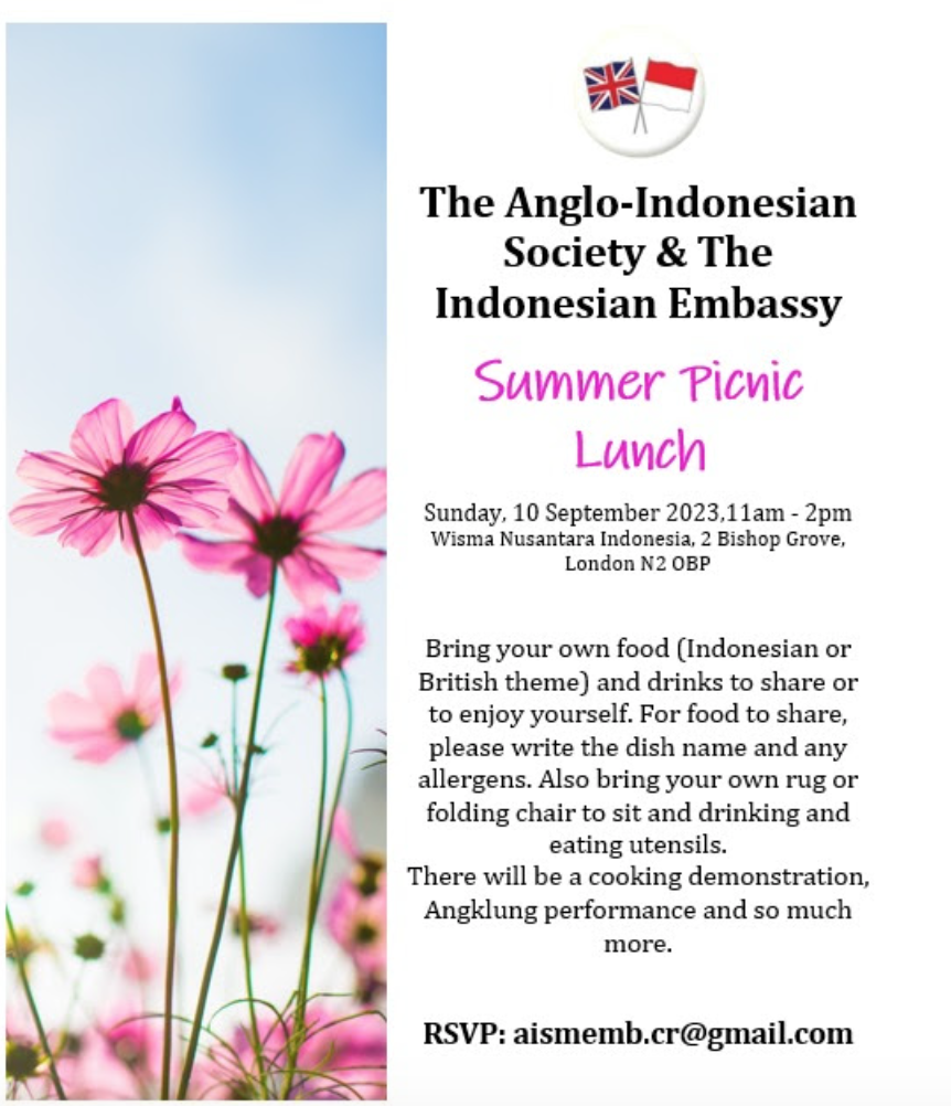Sunday September 10, 11am-2pm at the Indonesian ambassador’s residence.