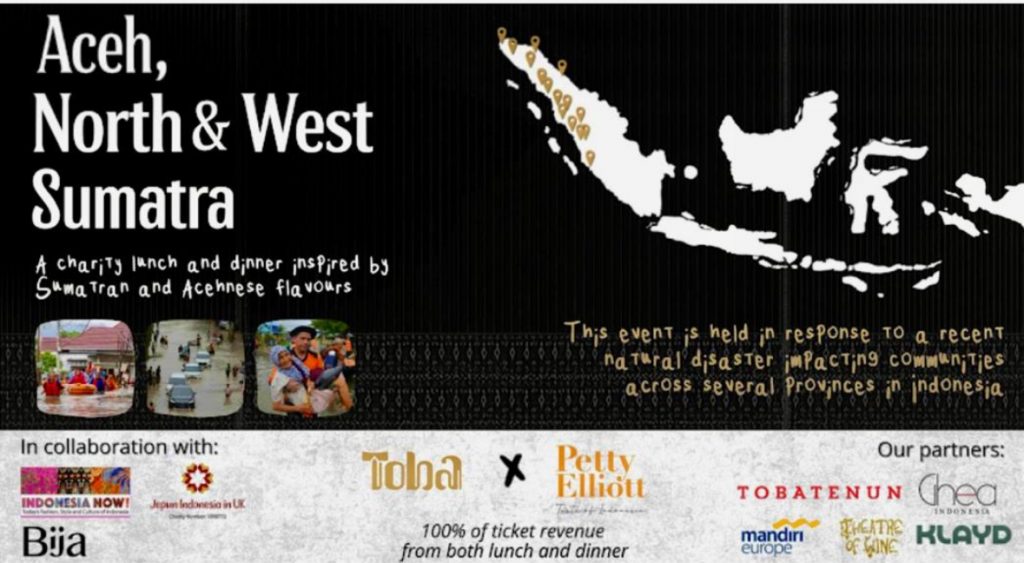 Toba, in collaboration with chef Petty Elliott, Jepun Indonesia in UK Charity (registered charity no. 1098772), Bija Coffee and Indonesia now UK will be hosting a charity lunch and dinner, with menus inspired by Sumatran and Acehnese flavours.
